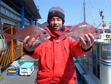 | 今回は、なじみの船宿海生丸に乗り込んだ。もちろんマダイダービーにおいて優位を得るために選んだのがその理由だ。5時集合に間に合ったのは6人で、後の2人(海生丸掲示板で常連さんの人たち)は後からやってきた。もちろん船長の性格からして5時きっかりに6人でくじ引きが始まった。くじは4番を引いてこりゃだめだと思ったがなんと席は左舷ミヨシが取れて俄然やる気が倍増し、気分よくロッドーキーパーをセットする。三保に向かう途中の様子からして多少うねりがあるようで時々船底がガンと叩きつけられ船全体にショックがつたわる。いつものようにいったん釣り場の手前で待機して日の出を待っていっせいに船長がここぞと思うポイントめざし突っ走る。もちろん海生丸はその先頭だ。後から大政丸や長徳丸がこれに続く。船長の「はいやって」の合図と共にコマセカゴをほおりこむ。棚は25メートルだ。朝のミーティングではマダイダービー中ということもあり、いつもは数釣りが心情の船長も今回ばかりは大物ねらいで行くと宣言、いつもより沖目を長く流すとの事。棚指示が刻一刻と変わり「5メーター上げて」の巻き上げ中、船中最初の当たりが僕に。しかも一投目にだ。型は小さいがまずまずの滑り出しにちょっと満足気味。直ぐにでも次が来そうな雰囲気で竿を手持ちで待ち受ける。特に棚が15メーターになった時が勝負時、過去の実績から一番大物が釣れるタイミングらしい。棚指示15メーターがアナウンスされはやる気持ちを抑えながらこれに合わせる、が、こない、あれ、おかしいなー。今日は風を船の正面から受けると、うねりを真横から受ける形になり、僕の竿(ダイワ:食わせ真鯛エックス350-30)でも置きさおにすると竿先がはねてしまい、うねりをかわそうとずーと手持ちでがんばった。こんな時は何をやってもだめのような気もしたが状況打破とばかり僕だけ手持ちで、他の人は竿がはねようが何しようが置き竿でした。そのかいあってか何とか二枚目をゲット、メジナも追加した。ちなみに今日は船中マダイ4枚でした。久しぶりの竿頭釣行にほっと一息、張り詰めた気分が半分ぐらいにはなったが、残りの半分の気がかりなことは一見さんの記録なのは言うまでも無い。船長曰く、ダービーはまだ始まったばかり。後2週間もすればのっこみが始まるので勝負はそれからとのことでした。 |