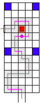 黄金銃の取り方です。 黄金銃のある部屋の床は、正方形のタイルが敷き詰められたようになっています。 正しいタイル以外を踏むと機銃が出現。 ですので、下の図のようなルートで進んで下さい。 紫の線の通りに進み、紫の点の位置に着くとケースが開き 無事黄金銃をゲットできます。 図の青い□は機銃の位置です。