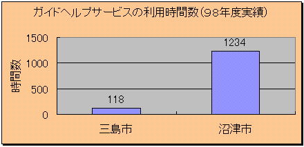 障害をもつ市民の外出をサポートするガイドヘルプサービス。三島市と沼津市と、利用の実態を比べてみました。三島市と沼津市とでは人口が倍違いますが、そのことを考慮しても実績に大きな違いがあります。三島市ではあまり利用されていません。