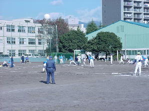 ここ、三島北中学校のグランドで、視覚障害をもつ人のソフトボールの試合が行われました。休日の静かなグラウンドに、選手たちの大きな声が響いていました。 |