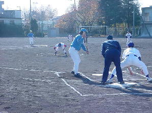 ダイアモンドは守備用と走者用が二重になっています。ベースが2つあるのもそのため。守備と走者が接触する危険を避けるためだそうです。 |