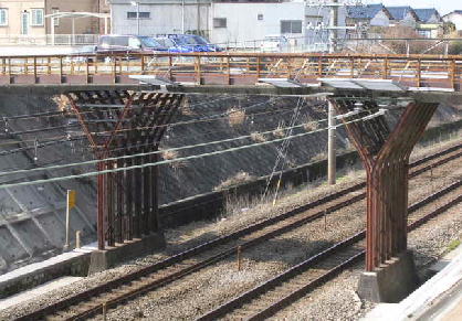 JR東海道線にかかる「天神原跨線橋」。加茂川町です。自動車教習所の上に位置し、この橋をわたり願成寺方面に下れます。実はこの橋、橋脚が古いレール。それもその筈。昔、東海道線がいまの御殿場線から現在の路線に変わったとき、昭和7年に築造されました。この「レール」はその当時のまんまです。 |