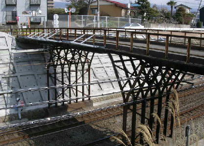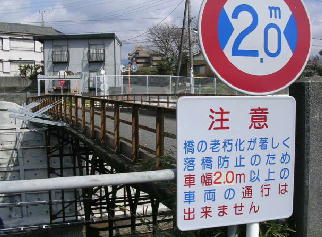 「落橋防止」のため、車の通行規制がとられていますが、乗用車は通れますし現に通ってます。築後70年を経て、一般的な設計耐用年数(当時の)50年を遙かに過ぎてしまい、またレール部の腐食も指摘され、はやく架け替えなどの対応が求められています。 |