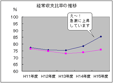 紺色のラインは臨時財政対策債を収入に含まない数値 ピンクのラインは臨時財政対策債を収入に含む数値 ややこしいですね。いま、自治体の財政指標はこのようにややこしい状況にあります。「臨時財政対策債」というシロモノが入り込んできているのでややこしくなっているのです。 これは何かというと、普通地方交付税の不足額を借金によって補う形になっていますが、この借金のことです。 一般財源のひとつである普通地方交付税が、01年度以降、普通地方交付税の一部がこの臨時財政対策債という借金でまかなわれています。この臨時財政対策債を経常収支比率を計算するうえで、「含める」「含めない」で比率がかわってきます。 |