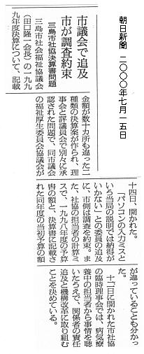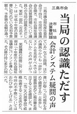 三島市議会福祉厚生委員会は十四日、市役所で協議会を調き、市社会福祉協議会の決算問題について議員らが当局の認識をただした。栗原一郎氏(市民ネット)は「平成十年度の決算書に記されている当初予算額と、予算書の金額が違っている」などと指摘。ほかの議員らからも「会計システムを見直すべきではないか」との声が上がった。 栗原議員の指摘に対し市側は「十年度から社会福祉協議会にパソコンを導入した。その移行時に多少の間違いが起こった可能性も含めて調査する」と答弁し、同委員会あてに報告書を提出することを確認した。また、「先ごろの理事会で組織改善することを決めた。今回の不手際についてはおわび申し上げる」と述べた。 | ||