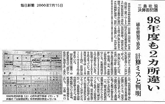三島市社会福祉協議会(出口隆一会長)の1993年度決算害が数十力所も間違っだまま理撃会に提出された問題に関連し、栗原一郎市議(無所属)が14日開かれた同市議会福祉厚生委員協議会で、98年度にも2カ所違いがあることを指摘した。委員からは「問違いばかりでは市民からの誤解を招く」との声が上がった。 食い違いがあったのは、社協の一般会計・社協運営費と共同募金配分金特別会計・事業費。本来、予算書と決算書は同額になるはずのところ、社協運営費は予算書には3398万9000円と記載されでいるが、決算書では3458万9000円となっていた。事業費は予算書では1462万2000円が、決算書にはl447万2000円と記載されていた。同社協理事の山田孝・市福祉事務所長は「調査しで委員会に報告する」と答えたが、委員協議会終了後に社協事務局と市社会福祉課が検算したところ、項目ごとの数字は正しかっだが、予算書の計算ミスで合算欄に誤っだ数字が書き込まれでいたことが判明した。一方、99年度の誤記載決算書が配布されたことについて、山田所長は「職員がパソコンを使って決算書を作成する際、前年度の数字が残っていだ決算書に上書きし一部を書き忘れたままフロッピーに保存したため」と、社協事務局と同様の説明を繰り返した。誤記載の経緯については今後、担当職員から事情聴取するという。【太田誠一】 | ||