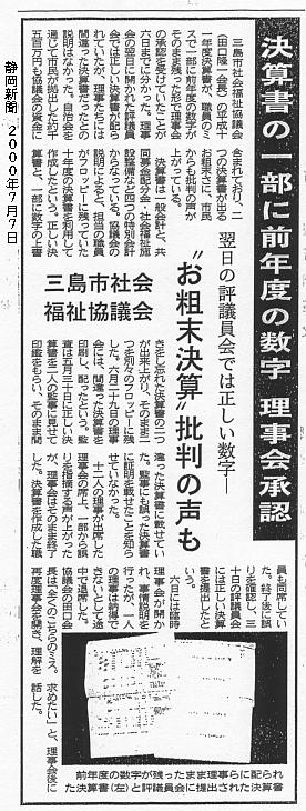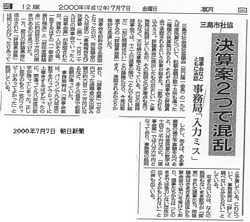 三島市社会福祉協議会(田口隆一会長)の平成十一年度決算書が、職員のミスで一部に前年度の数字がそのまま残った形で理事会の承認を受けていたことが六日までに分かった。理事会の翌日に開かれた評議員会では正しい決算書が配られていたが、理事たちには間違った決算書だったとの説明はなかった。自治会を通じて市民が拠出した約千五百万円も協議会の資金に含まれており、二つの決算書が出るお粗末さに、市民からも批判の声が上がっている。 決算書は一般会計と、共同募金配分金・社会福祉施設整備など四つの特別会計からなっている。協議会の説明によると、担当の職員がフロッピーに残っていた十年度の決算書を利用して作成したという。正しい決算書と、一部に数字の上書きをし忘れた決算書の二つが出来上がり、そのまま二つを別々フロッピーに残した。六月二十九日の理事会には、間違った決算書を印刷し、配ったという。監査は五月三十日に正しい決算書を二人の監事に見せて印鑑をもらい、そのまま間違った決算書に載せていた。監事にも誤った決算書に証明を載せたことを知らせていなかった。 十二人の理事が出席した理事会の席上、一部から誤りを指摘する声が上がったが、理事会はそのまま終了した。決算書を作成した職員も同席していた。終了後に誤りを確認し、三十日の評議員会には正しい決算書を提出したという。 六日には臨時理事会が開かれ、事情説明を行ったが、一人の理事は納得できないとして途中で退席した。協議会の田口会長は「全くこちらのミス。再度理事会を開き、理解を求めたい」と理事会後に話した。 | ||