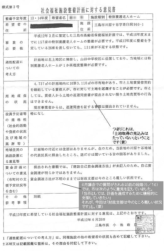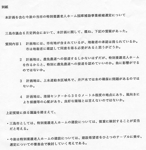 6月末日、三島市がこの特養ホーム計画に対し県に提出した意見書
